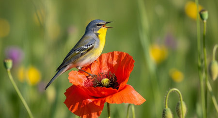Singing warbler perched atop vibrant red poppy blossom