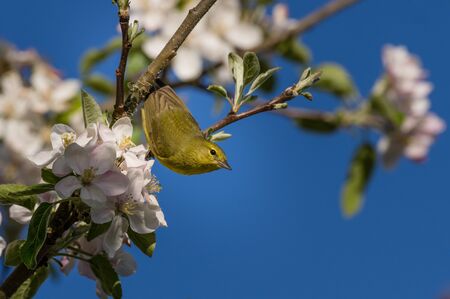 Orange-crowned Warbler (Oreothlypis celata) and apple blossoms in the Willamette Valley, Oregon.