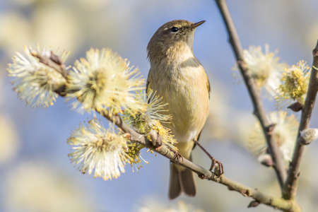 Common chiffchaff, lat. phylloscopus collybita, sitting on branch of bush in spring and looking for food. Cute little warbler. Songbird in wildlife.
