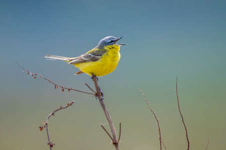 Closeup of a male western yellow wagtail bird Motacilla flava singing in vegetation on a sunny day during spring season.