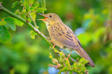 Grasshopper warbler bird Locustella naevia on a tree branch during springtime in a forest.
