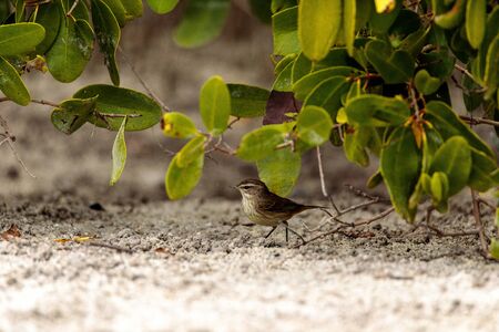 Pine warbler bird Setophaga pinus forages for food in the beach sand on Marco Island, Florida