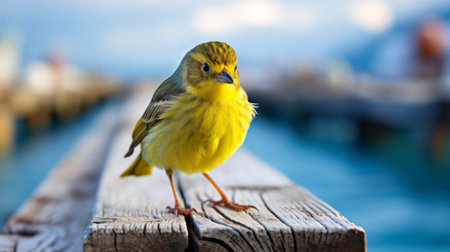 a yellow bird perched on a wooden railing overlooking a vibrant blue bay. this photo, inspired by the focus stacking technique, showcases bold saturation and emotive body language. the rough hewn surfaces add texture to the scene, reminiscent of the works of charles spencelayh and jillian tamaki. the use of bright colors enhances the visual impact. ai generated