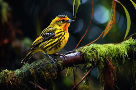 a small bird perches on a moss-covered branch in the norwegian wilderness, showcasing a beautiful blend of dark yellow and orange hues. the bird strikes a dignified pose, reminiscent of wimmelbilder and whistlerian art styles. this national geographic photo captures the essence of cranberrycore aesthetics in the midst of stunning norwegian nature. ai generated