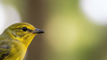 A detailed close-up shows a small, yellow bird with dark eyes and a black beak. The bird's feathers display subtle textures. The background features soft, blurred green hues. This image could be suitable for nature publications, educational materials, or various commercial projects.