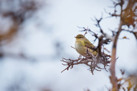 Beautiful bird of Common chiffchaff (Phylloscopus collybita) sitting on autumn tree branch on blue sky background