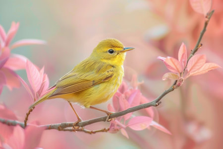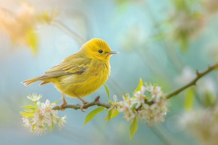 Yellow Warbler bird on a branch of a blossoming cherry tree