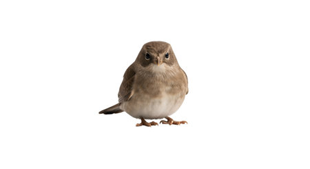 A small, fluffy brown bird with a lighter white chest is depicted facing directly forward. Its beady eyes are clearly visible, and its tiny feet are splayed. The bird appears plump and cute, presented in a studio shot against a black background, making it isolated and the sole focus.