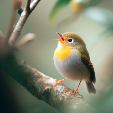 close-focus shot of a nightingale singing on a branch, created with generative ai