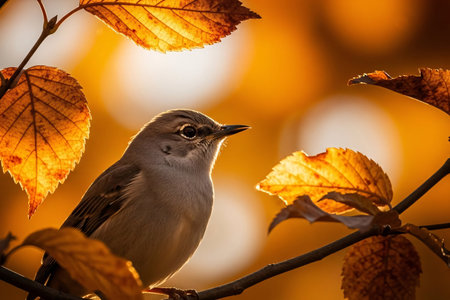 A bird backlight glow captures during autumn across perched sun showcasing detail nature golden hour light fills the scene amber burnt orange shaped feathers eye.
