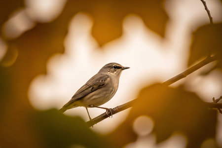 A bird cinematic branch captures during autumn under softly subject reflecting stillness garden golden sunlight bathing the full scene warm color grading creamy natural soft.