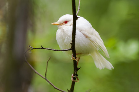 A closeup shot of a tiny Albino European robin standing on a tree branch under the sunlight