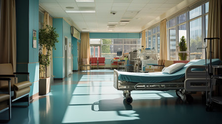 AI Generative Interior bright hospital room in medical clinic, healthcare and recovery after surgery or illnes