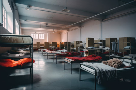 Rows of beds in a shelter. The concept is social assistance