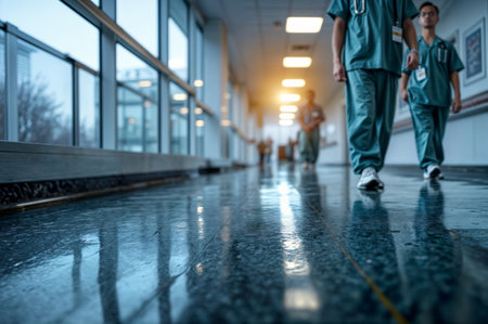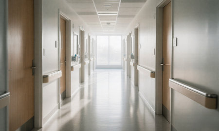 Modern, clean, and well-lit hospital corridor with closed doors and a reflective floor, conveying a sterile medical environment
