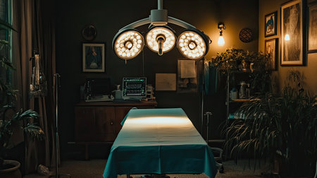 This image showcases a serene operating room, featuring bright surgical lights and essential medical equipment. The calm ambience is complemented by indoor plants, creating a welcoming environment for patients and medical professionals alike.