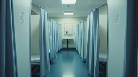 A row of empty white hospital cubicles separated by clean curtains, bright and professional.