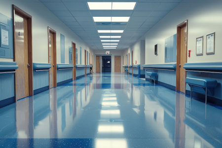 An Abandoned medical facility, empty hallway, healthcare crisis, sterile environment, blue flooring, hospital corridor