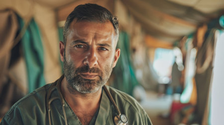 Man nurse volunteer in refugee camp, providing critical healthcare and support amidst a humanitarian tragedy. Generative ai.