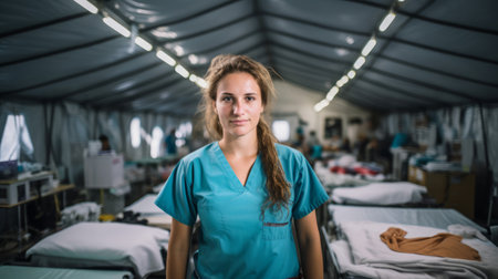 Nurse in disaster relief camp aiding survivors resilience highlighted