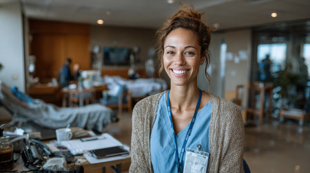 A cheerful healthcare professional exudes warmth and dedication in a hospital setting, embodying compassion and teamwork to enhance patient care and experience.