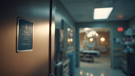 This image showcases a hospital corridor emphasizing a patient room entry with clear signage. The soft lighting enhances the clinical atmosphere while highlighting medical equipment in the background.