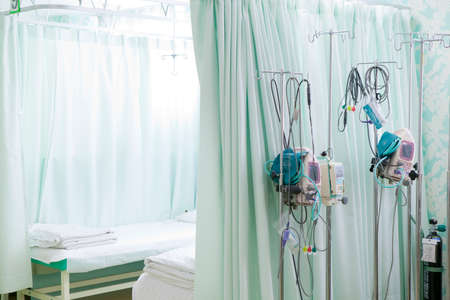 Image of empty bed for patient with dropper and lamp that disinfecting the hospital ward