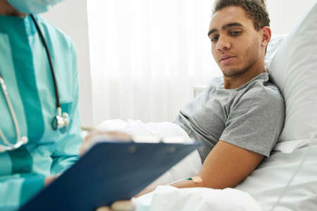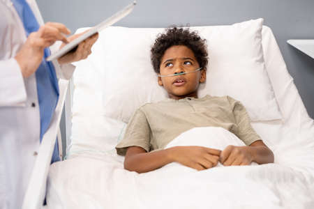 African little boy lying in bed and listening to recommendations of doctor who visiting him in hospital ward