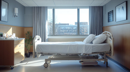 A well-lit hospital room featuring a patient bed, medical supplies, and a large window with a city view, promoting a healing atmosphere.