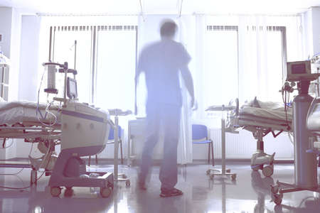 Abstract silhouette of a male doctor in a hospital room.