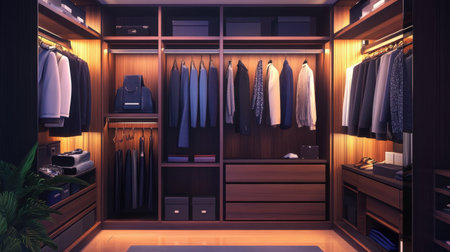 Modern wardrobe interior showcasing sleek organization, with clothes and accessories arranged in a clean and photorealistic design.