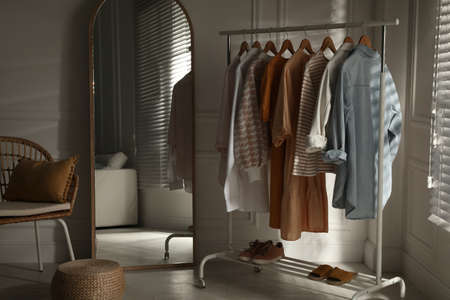Colorful clothes hanging on rack in room. Fashionable interior design