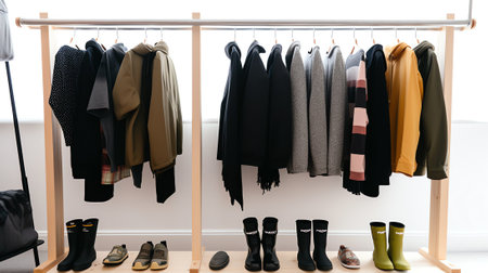 Minimalist wardrobe with neatly arranged clothes and accessories, no people, plenty of copy space