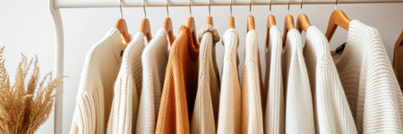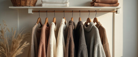 A collection of soft, textured sweaters in warm, earthy tones hangs neatly on a wooden rack, exuding a sense of comfort and style. The gentle lighting and natural elements create a serene atmosphere, perfect for a cozy home setting.