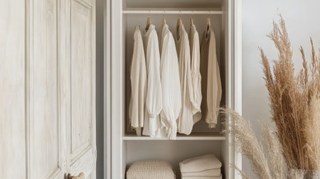 This image showcases a cozy wardrobe featuring soft textiles, neutral colors, and a minimalist design. Perfect for enhancing home aesthetics with simplicity.