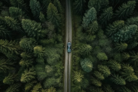 Aerial view taken by drone of a car driving on a forest road in autumn