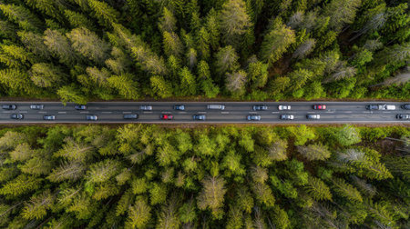 Rush hour traffic in the middle of the forest. Ecological concept. Aerial top view of cars in a traffic jam
