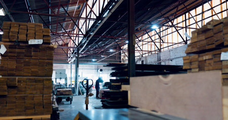 Logistics, empty and stack of wood, warehouse or material for furniture, supply chain or business. Production, shipping and collection of cargo in factory, export or goods for distribution or storage