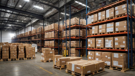 Vast logistics warehouse brimming with boxes, parcels, and merchandise ready for distribution