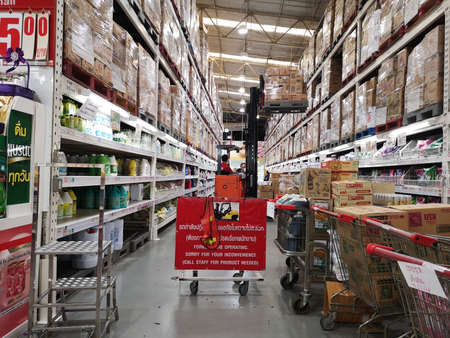 CHIANG RAI, THAILAND - MARCH 7, 2019 : unidentified workers arranging goods with truck in supermarket on March 7, 2019 in Chiang rai, Thailand.