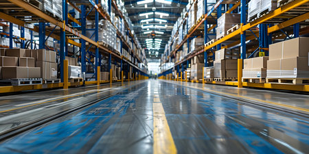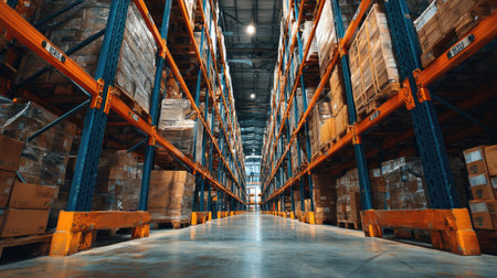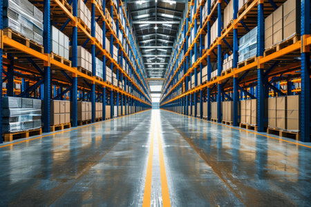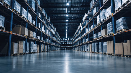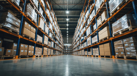 Spacious and organized warehouse interior with industrial shelving and bright illumination