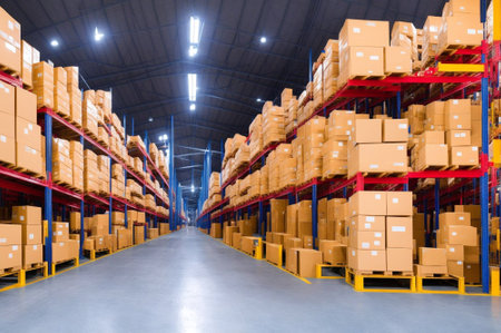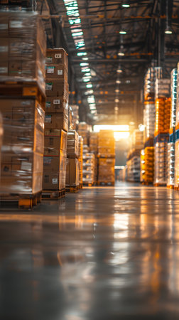 A massive storage area with towering racks and an assortment of packages, symbolizing the hub of commercial logistics