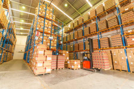 Umea, Norrland Sweden - January 9, 2020: a large warehouse with packages in yellow tone