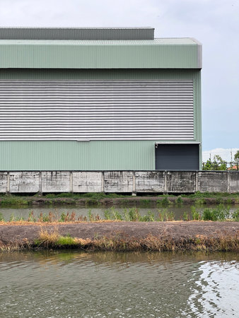 Interior of new large and modern warehouse space. Building materials warehouse, logistics concept, construction of houses, loader. high contrast and monochrome color tone. material, shipping.