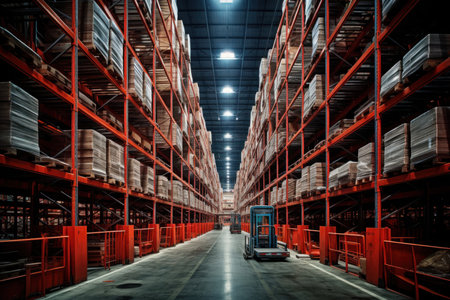 a warehouse with high shelves filled with boxes and products. Generative AI.