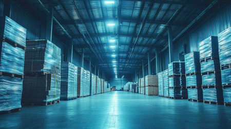 An interior warehouse scene shows stacks of packaged goods, bathed in cool, artificial light. The composition features a symmetrical arrangement, leading the eye into the space. The overall atmosphere suggests a commercial or industrial setting, possibly related to logistics, distribution, or storage applications. It is suitable for various editorial and commercial projects.
