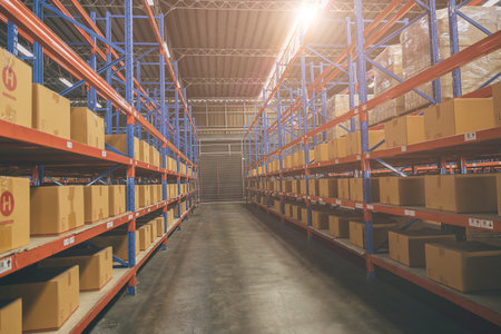 Large industrial warehouse storing cardboard boxes on metal shelves, representing concepts of logistics, distribution, storage, and inventory management