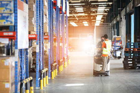 Portrait of worker in warehouse , they happy and working at The Warehouse. Storehouse area, Shipment. warehouse worker unloading pallet goods in warehouse