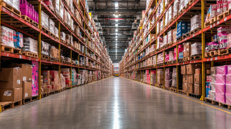 This image showcases a spacious aisle in a modern warehouse, lined with colorful boxes and packages. The organized layout facilitates efficient distribution and logistics management. The bright lights illuminate the scene and highlight the meticulously arranged inventory, essential for smooth operations in a commercial setting.