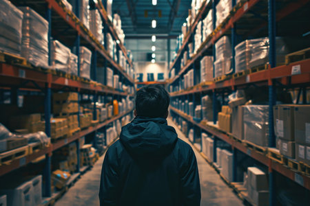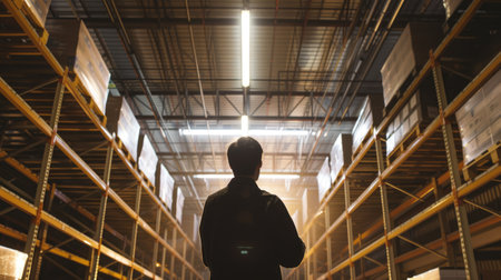 A man is working in a warehouse, surrounded by boxes and shelves. The atmosphere is busy and industrial, with the man focused on his task